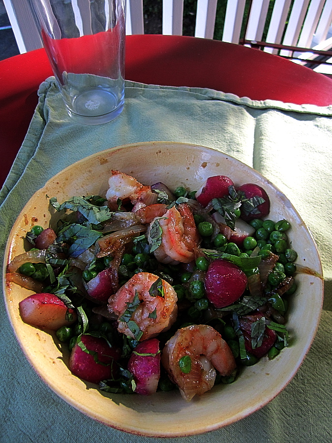 While this isn’t my best food styling photograph, this variation on the dish is pretty tasty. It’s pretty simple, just a few ingredients; radishes, peas, shrimp, onions and basil — salt and pepper to taste and a bit of olive oil. Pretty much it’s just sauted together.