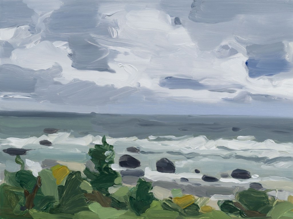 Some critics have reflected that the spareness of Gallace’s paintings make them abstractions more than figurative paintings. I personally find that observation to be glib, overlooking the way that her skillful design is layered with representational meaning.