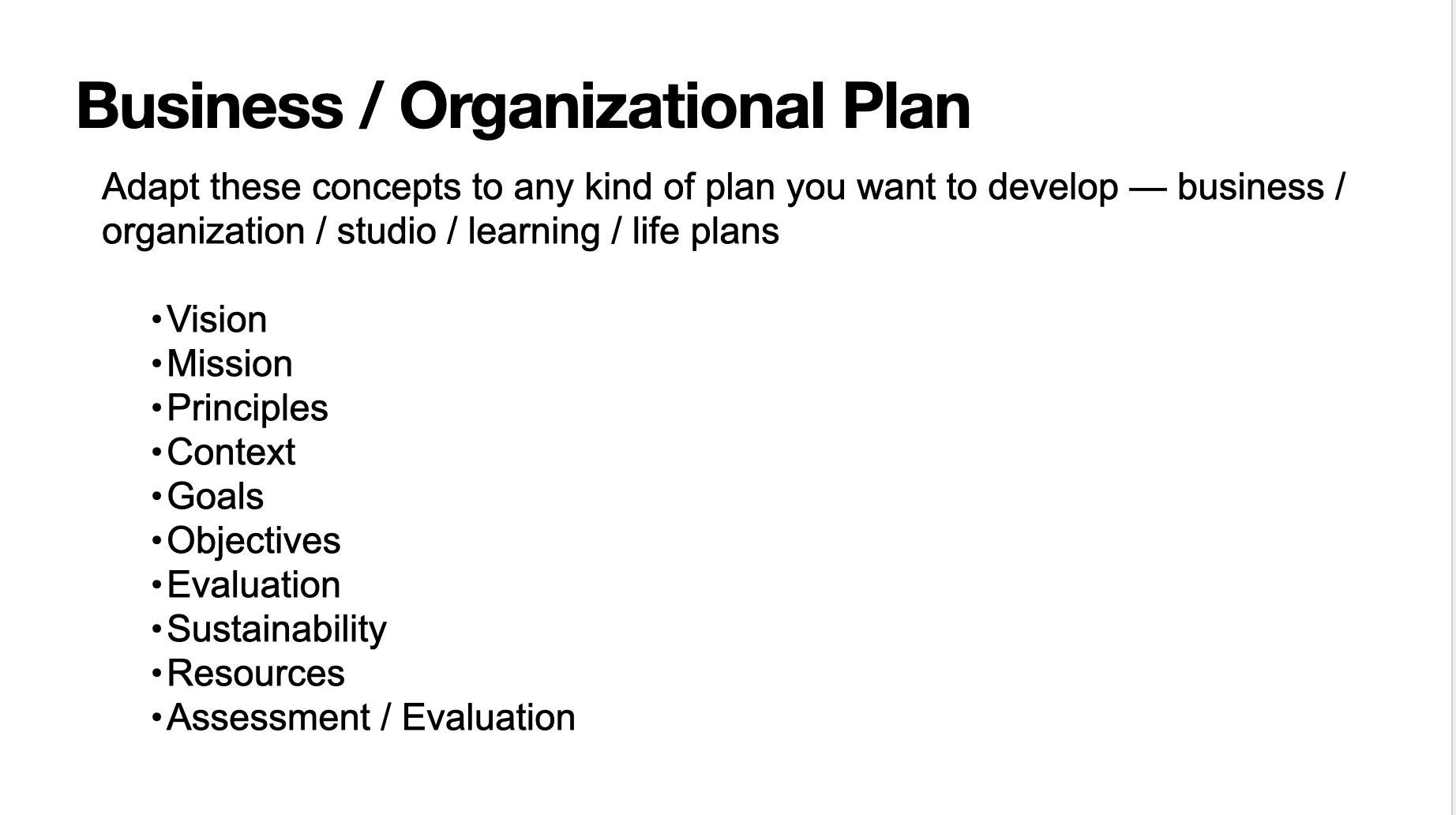 I use a hybrid process — shaping it from things I’ve learned from curriculum development and business planning. It’s a balance that works for me. Below is the basic outline I use for each bulleted point.