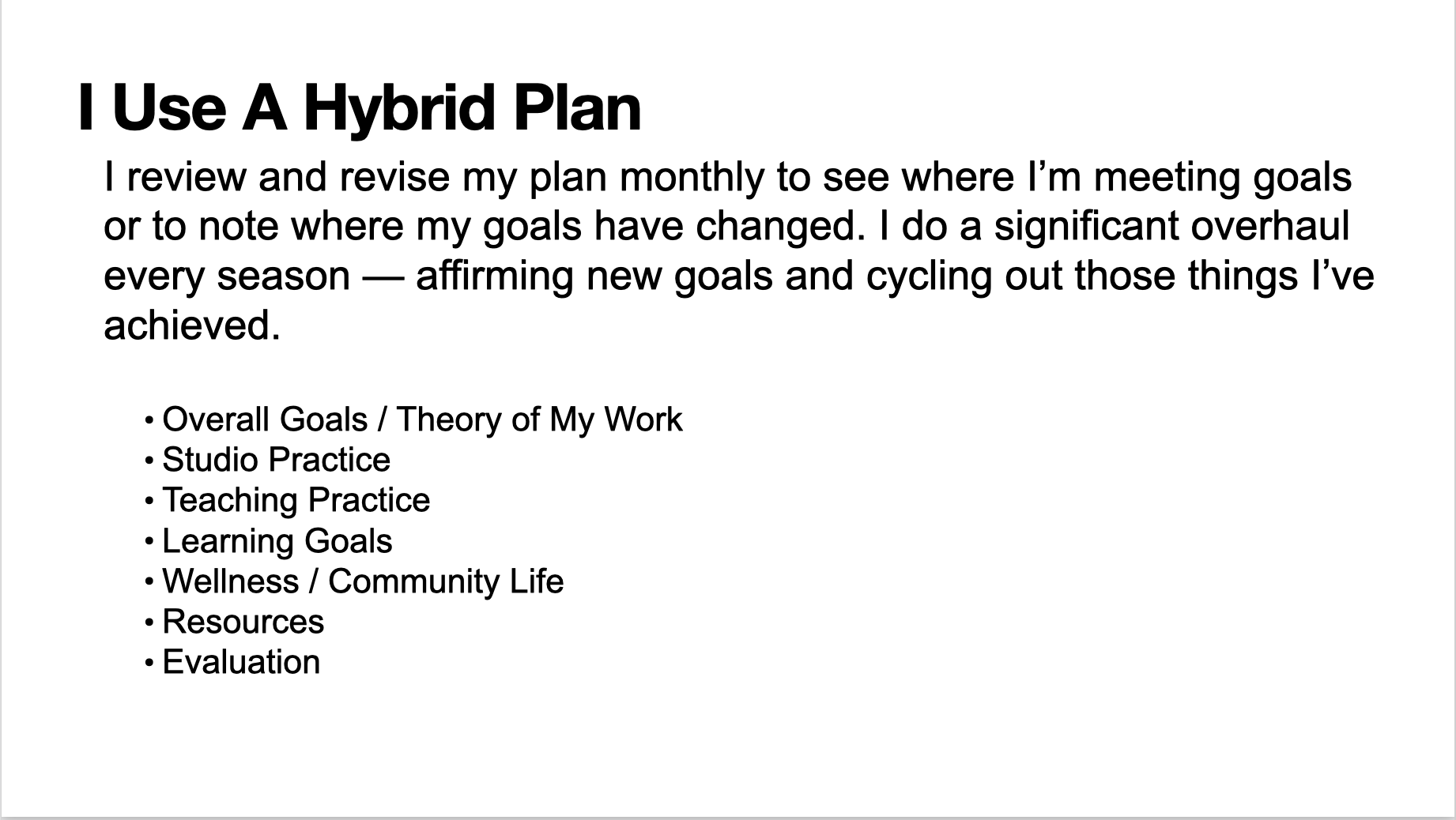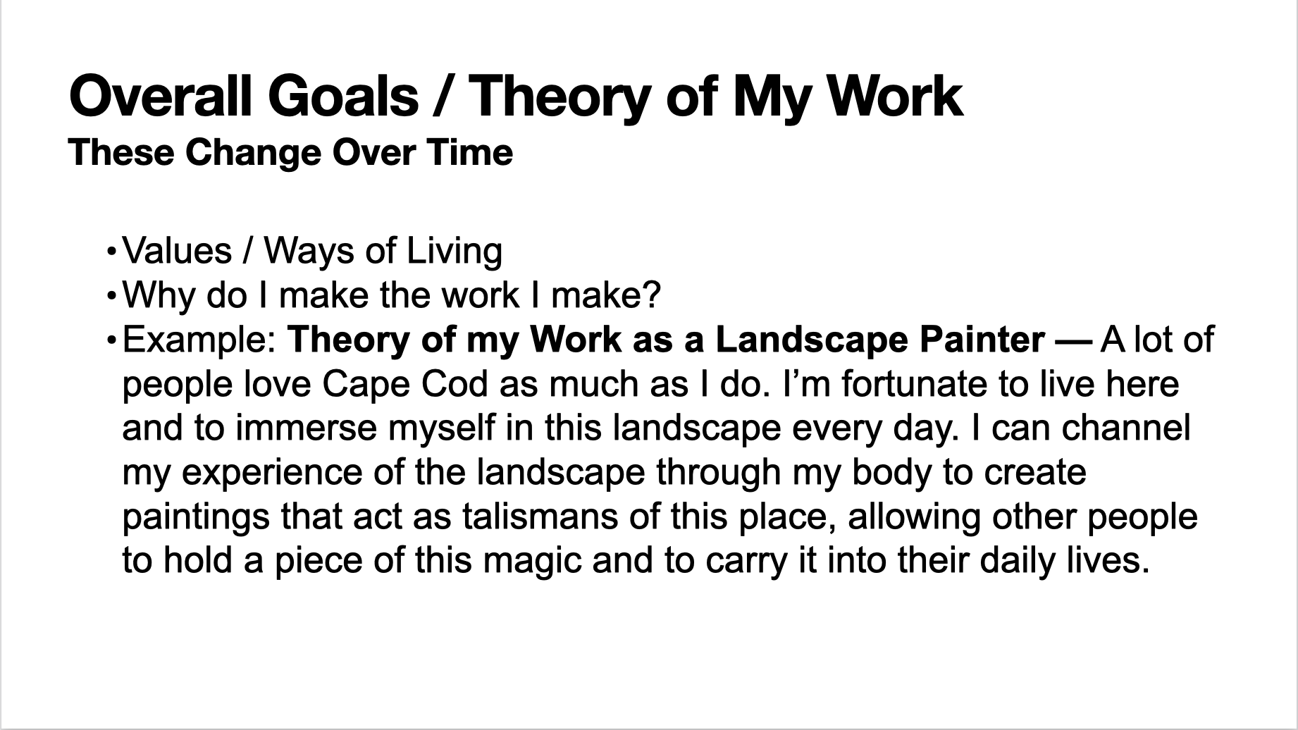 This week, I gave a workshop on planning at Provincetown Commons. It’s part of a professional development series we’re offering with the Outer Cape Community Development Partnership.  While it was ostensibly a ‘business planning’ workshop, I extended the metaphor to be inclusive of studio, learning and life planning. My rationale for extending the metaphor has to do with the vocational complexity of being an artist. Unlike other jobs I’ve had, I never leave the office. My art practice is an integrated part of my life. And to plan effectively, I need a holistic approach. In my experience this is true of other artists who, unlike me, might not think of themselves as a ‘small business owner,’ and who might better thrive through a different facet of their identity.