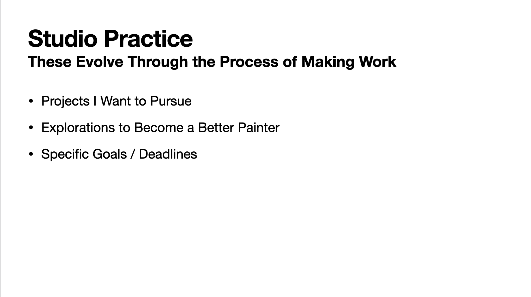 This section, on Studio Practice, captures ideas I have for projects, aspirations for improving as a painter, and concrete learning goals. It also establishes deadlines for projects, shows, and commissions.