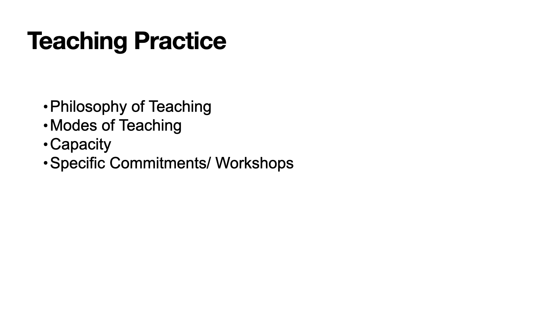 Teaching is an integral part of my practice and identity. It takes a lot of creative energy and can subsume all my time if I don’t plan carefully. This section helps me balance opportunities with my capacity while also documenting specific commitments.